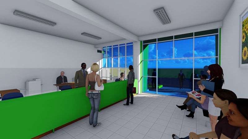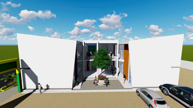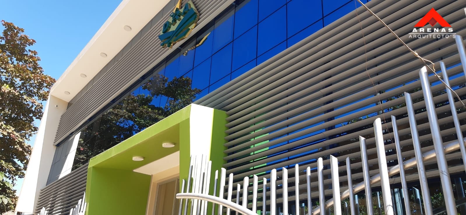 El edificio tiene un lenguaje contemporáneo y medio ambiental y tiene soluciones de acuerdo a las condiciones climáticas de la zona.