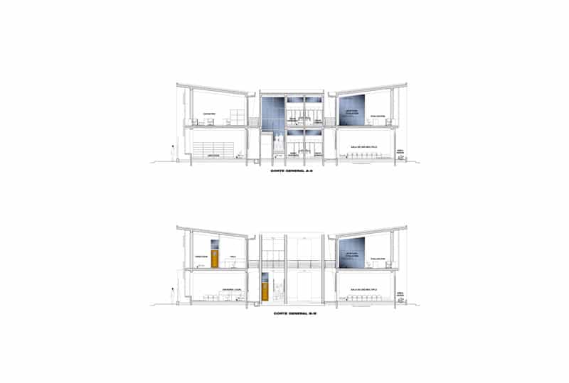 El planteamiento del proyecto consiste en generar un patio central y tres bloques de dos niveles que son articulados por el bloque central donde están situadas las escaleras.